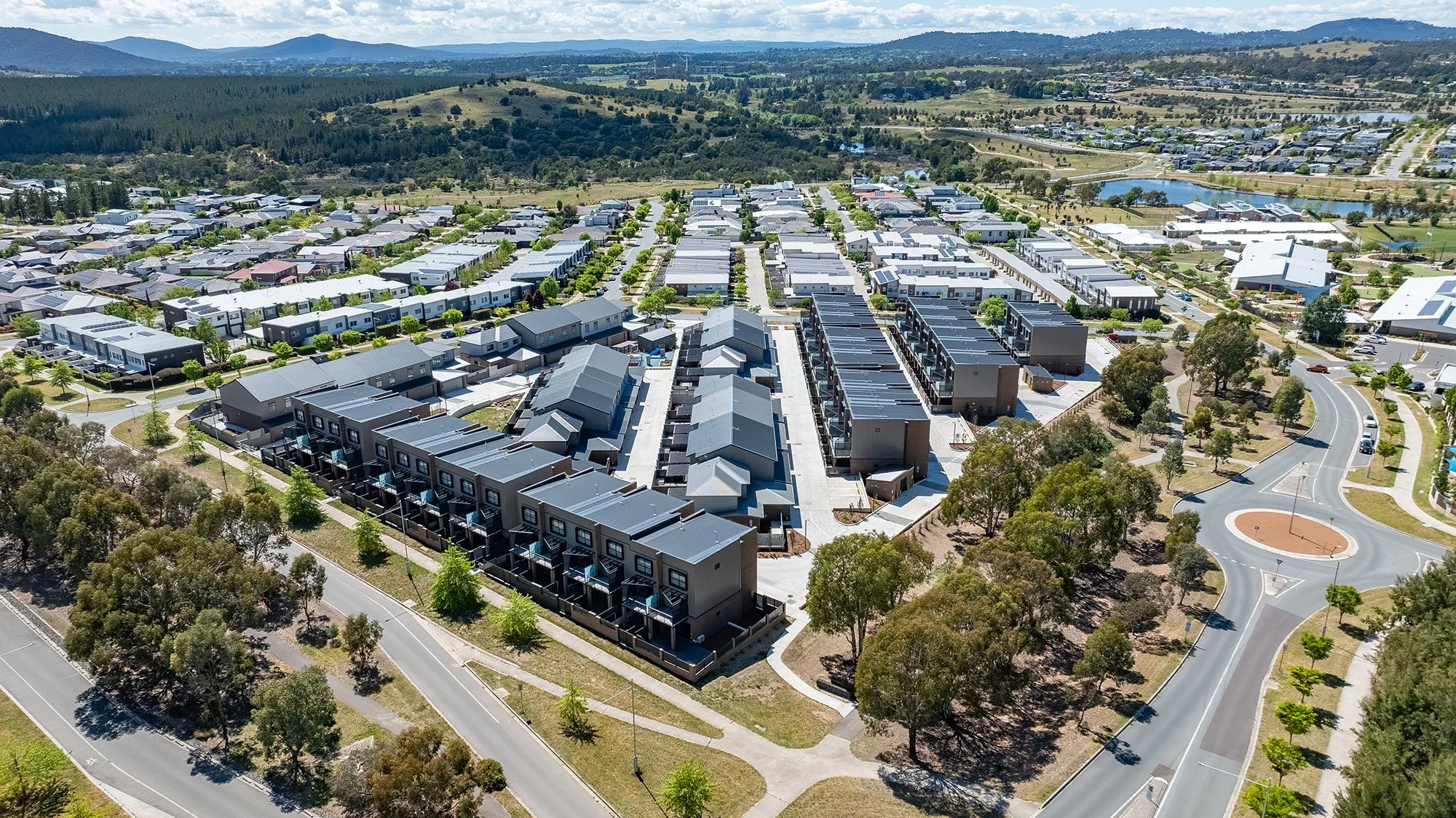 The Crossing in Coombs includes 83 two and three storey terrace stye townhouses delivered for Defence Housing Australia.